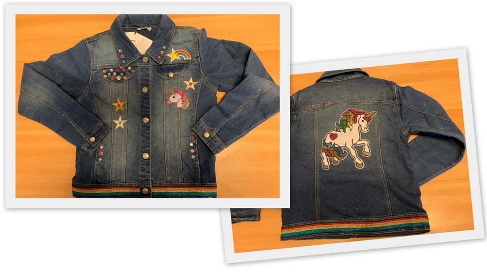 Voor een unicorn liefhebben van 10 jaar heb ik een stoer jackie gemaakt. uiteraard met unicorn applicaties, in combinatie met sterren en regenboog. De strass studs geven een 'schitterend' effect, wat goed past bij het regenboogband en paillettenapplicatie.